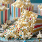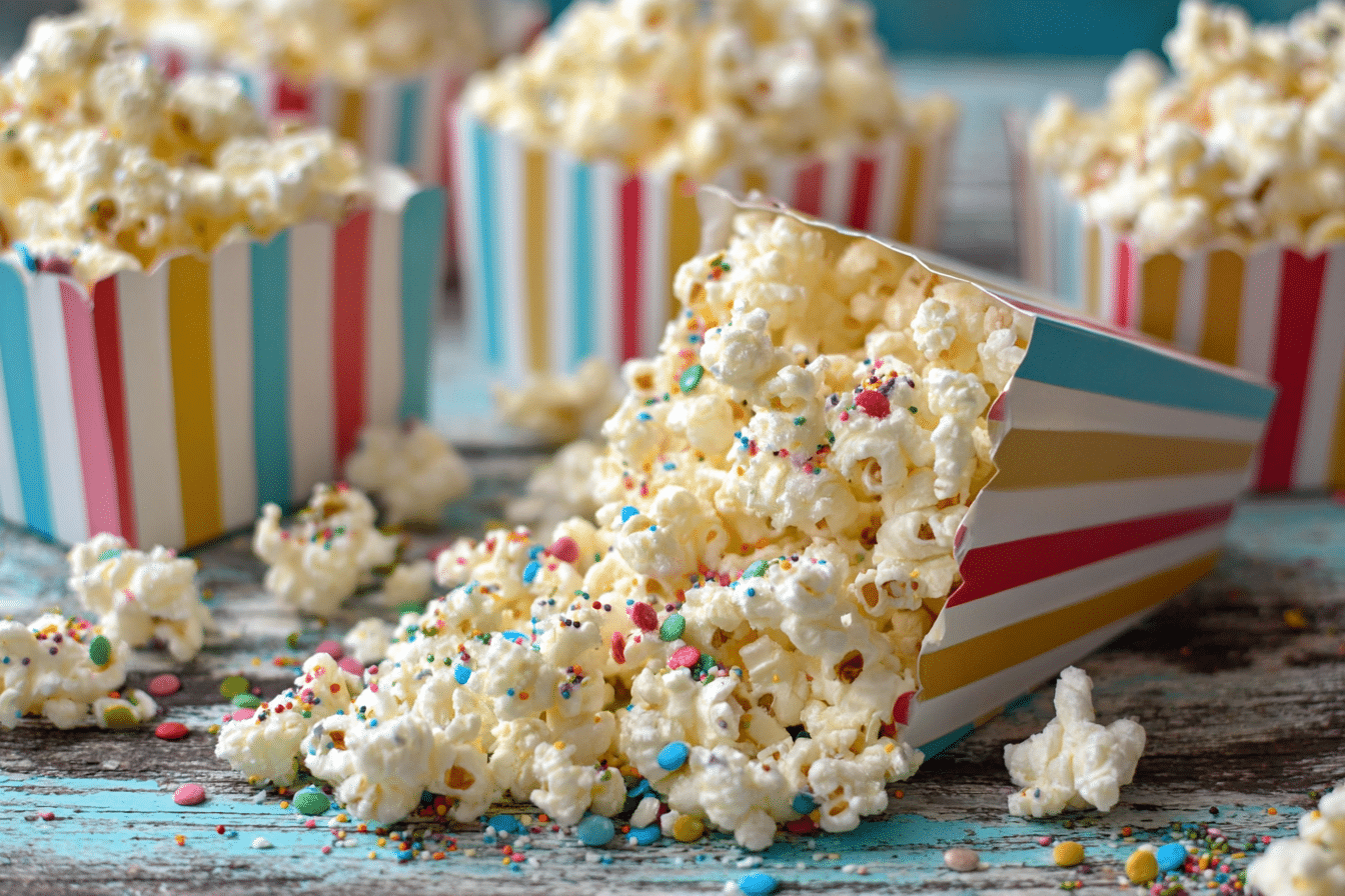 Beach Party Popcorn works beautifully at summer celebrations. Its bright colors and playful toppings make it a fun centerpiece for snack tables.