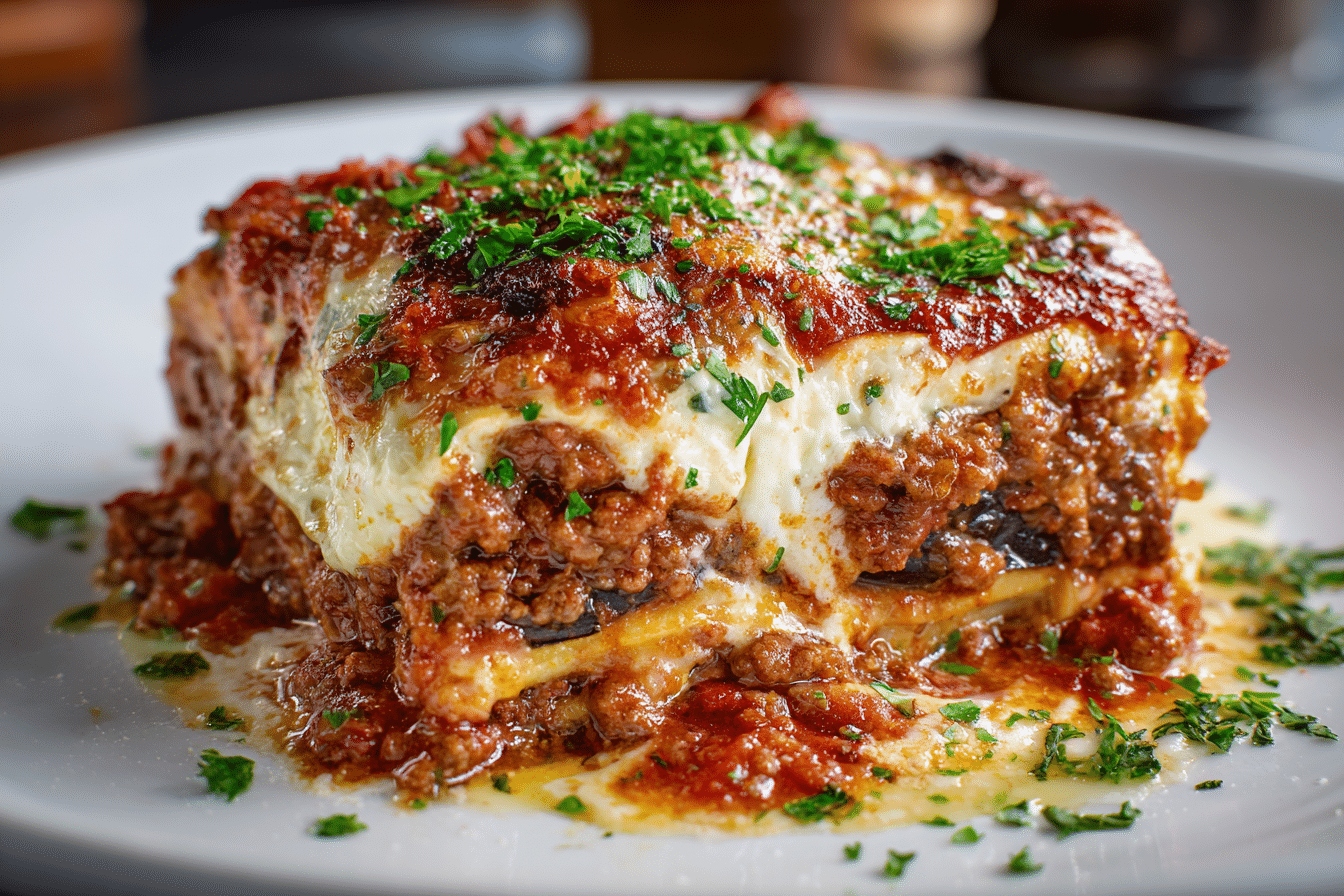 Each stack is individually portioned—ideal for dinner parties, meal prep, or elegant weeknight meals. Layers of savory meat ragù, silky eggplant, creamy béchamel, and melted cheese come together in a rustic yet refined presentation that brings out the very best of Italian flavors.