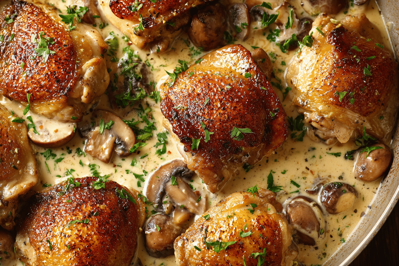 Irish Chicken in Whiskey Cream Sauce is a one-pot dinner featuring golden seared chicken simmered in a rich cream sauce with Irish whiskey, garlic, and fresh thyme. Ready in 35 minutes, it delivers warm, comforting flavor with minimal cleanup.