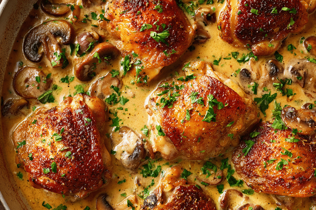 Irish Chicken in Whiskey Cream Sauce is a one-pot dinner featuring golden seared chicken simmered in a rich cream sauce with Irish whiskey, garlic, and fresh thyme. Ready in 35 minutes, it delivers warm, comforting flavor with minimal cleanup.