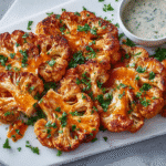 Buffalo Cauliflower Steaks are a bold, plant-based twist on classic buffalo wings — meaty, spicy, and incredibly satisfying. This version uses thick slabs of cauliflower, air-fried or oven-baked until golden and tender, then coated in a zesty buffalo sauce that delivers all the heat and tang without the meat.