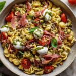 Prosciutto Caprese Pasta Salad brings together the spirit of a classic Italian caprese plate with the comfort of a chilled pasta dish. The pairing of sweet tomatoes, creamy mozzarella, fragrant basil, and delicate slices of prosciutto creates a bowl filled with color, aroma, and contrast. Each forkful carries a balance of savory cured meat, tender pasta, and juicy bursts from fresh tomatoes.