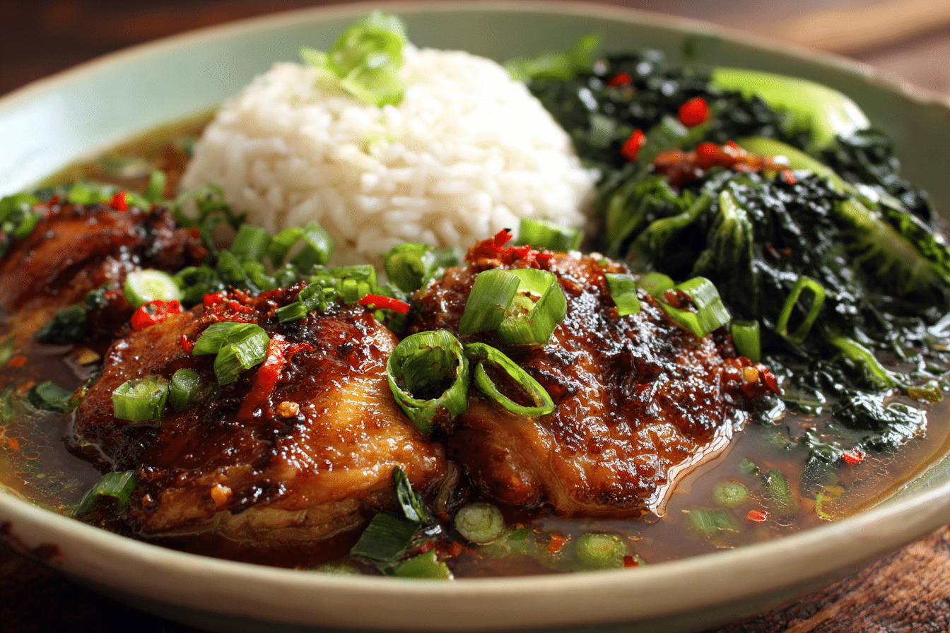 Caramelised soy-glazed chicken simmered in a fragrant garlic ginger broth, served over warm rice. A deeply savory, comforting dish packed with bold Asian flavors.