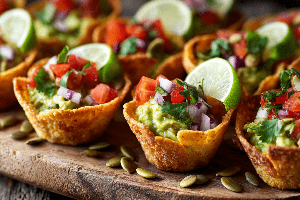 Creamy Vegan Guacamole Cups in Crispy Tortilla Shells