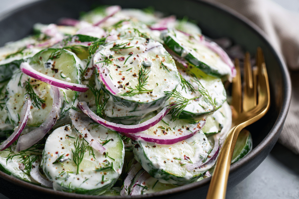 Creamy Cucumber Salad with Greek Yogurt Dressing is the kind of side dish that instantly refreshes a meal. Crisp cucumber slices are coated in a smooth, tangy dressing that feels …