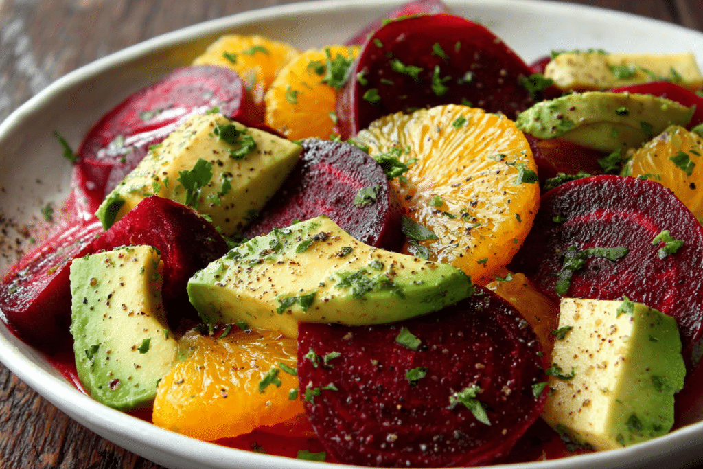 Roasted beet orange avocado salad is a vibrant dish that brings together earthy sweetness, bright citrus, and creamy richness in every forkful. The deep ruby tones of roasted beets contrast …