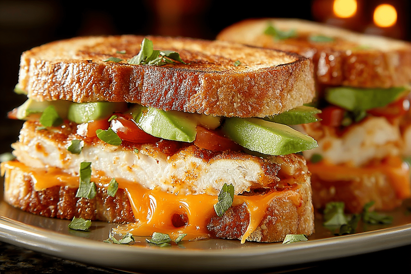 Chicken Avocado Melt Sandwich brings together juicy chicken, creamy avocado, and melted cheese layered between toasted bread for a warm, satisfying bite. The combination creates a rich texture with crisp edges, soft filling, and smooth, buttery flavor in every bite.