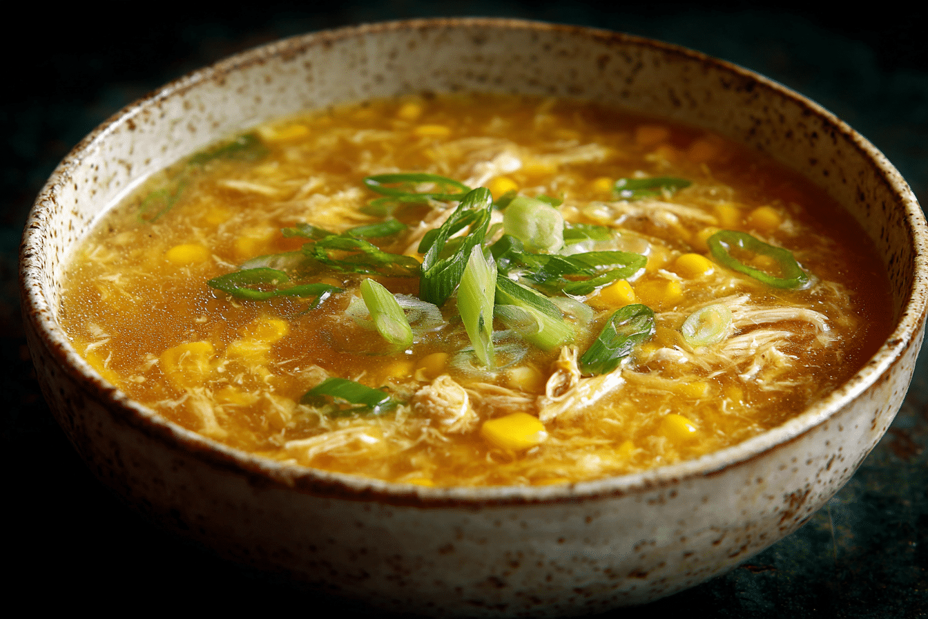 A comforting Chinese-style soup with tender chicken, sweet corn, and silky egg ribbons in a light savory broth. Quick, nourishing, and ready in 20 minutes.
