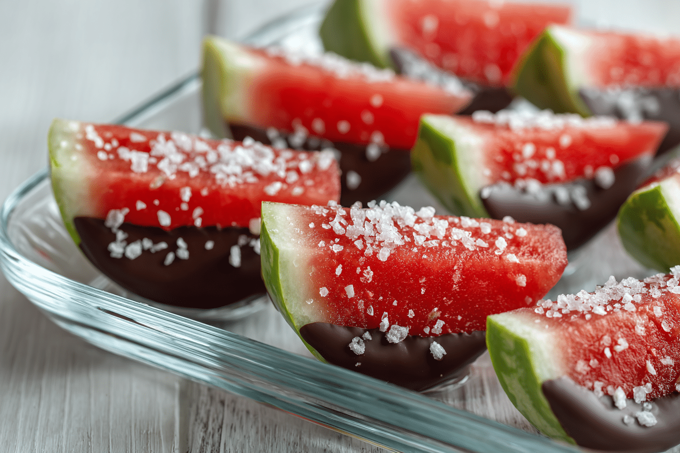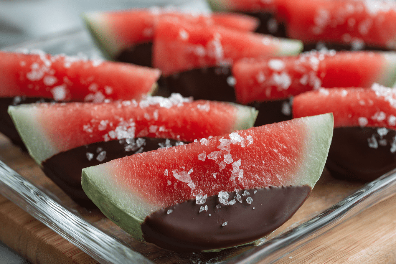 Another creative idea is to insert wooden sticks into watermelon triangles before dipping them in chocolate. This creates watermelon “pops” that are easier to hold and serve.