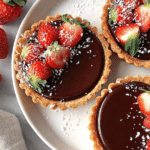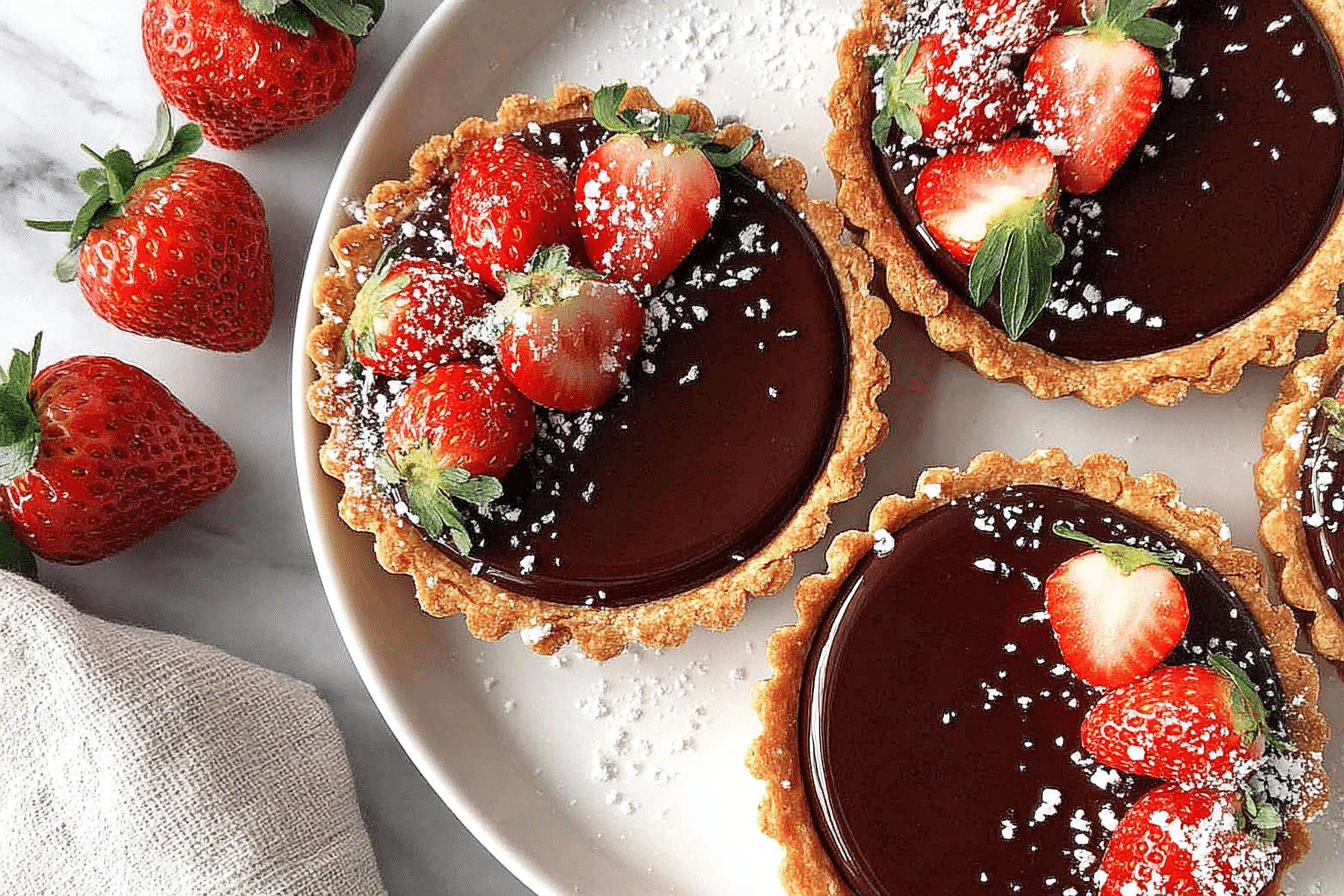 Elegant mini tarts with buttery shells, rich chocolate ganache, and fresh strawberries, perfect for a luxurious dessert.