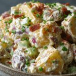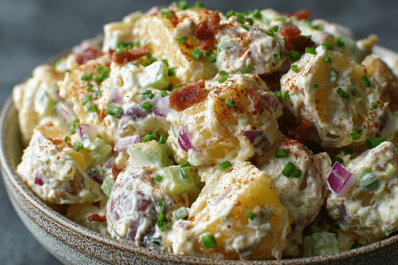 A hearty, creamy potato salad with tender potatoes, crisp vegetables, pickles, and a tangy dressing.