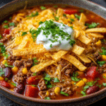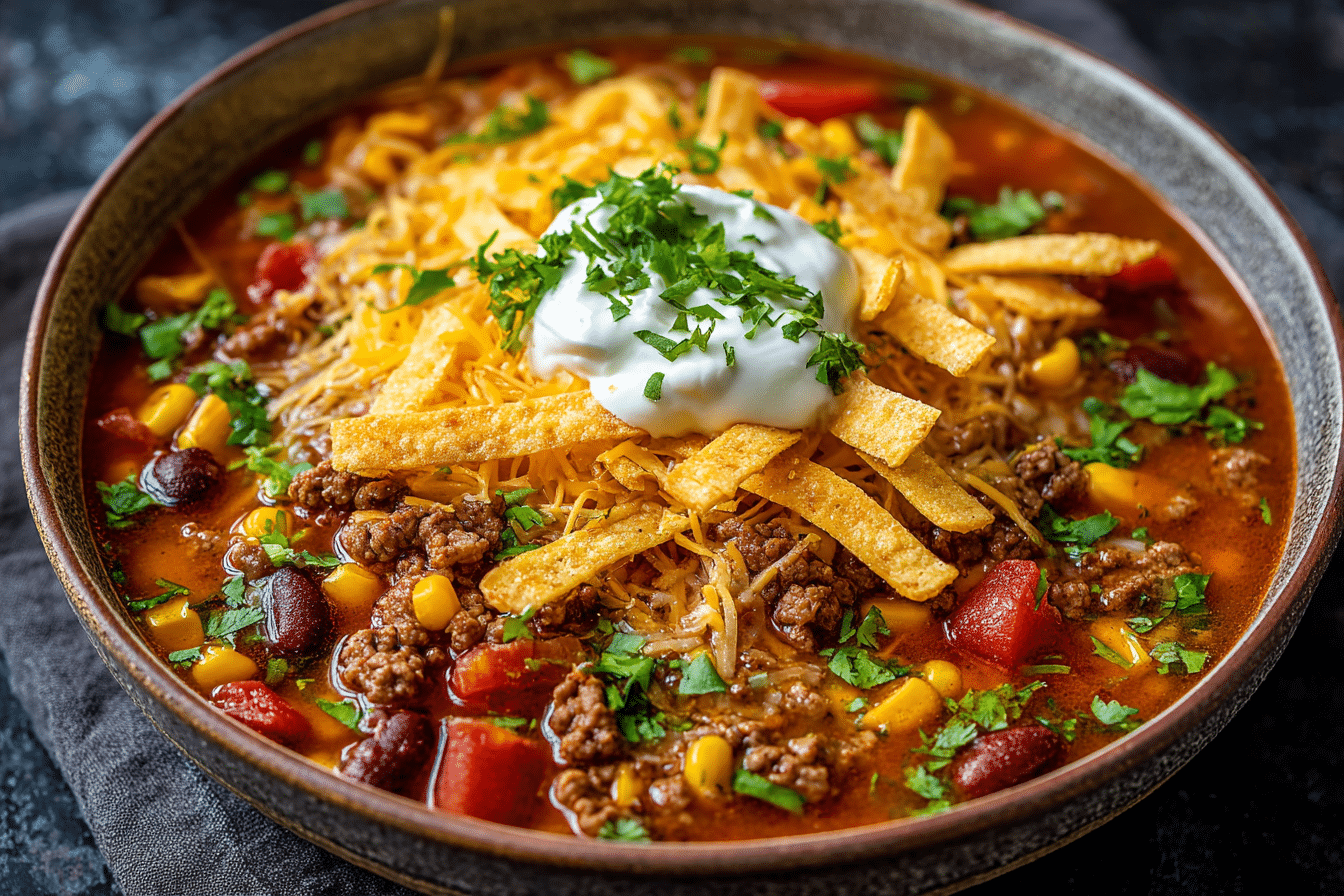 This taco soup is a hearty, one-pot dinner packed with ground beef, beans, corn, and zesty Tex-Mex flavor — ready in just 30 minutes.
