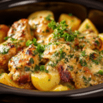 Tender, creamy, and packed with garlicky goodness, this Cozy Garlic Parmesan Crockpot Chicken & Potatoes recipe is the kind of soul-satisfying dish that makes any night feel like a warm hug. It’s one of those meals that delivers a rich, comforting flavor with minimal prep—just set it and forget it.