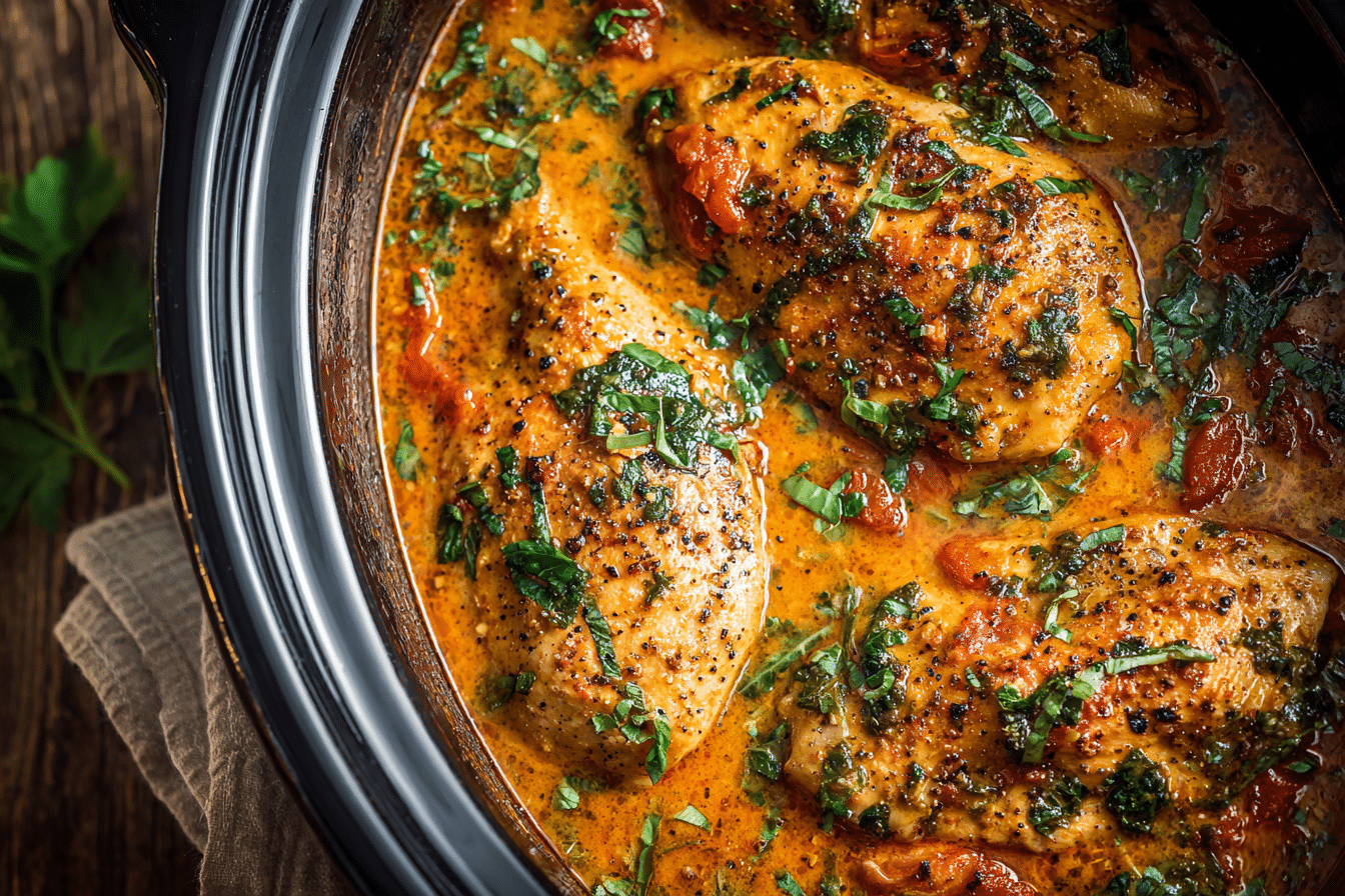 Creamy Tomato Basil Chicken is a comforting slow cooker meal with tender chicken in a rich tomato and basil sauce, perfect for easy weeknight dinners.
