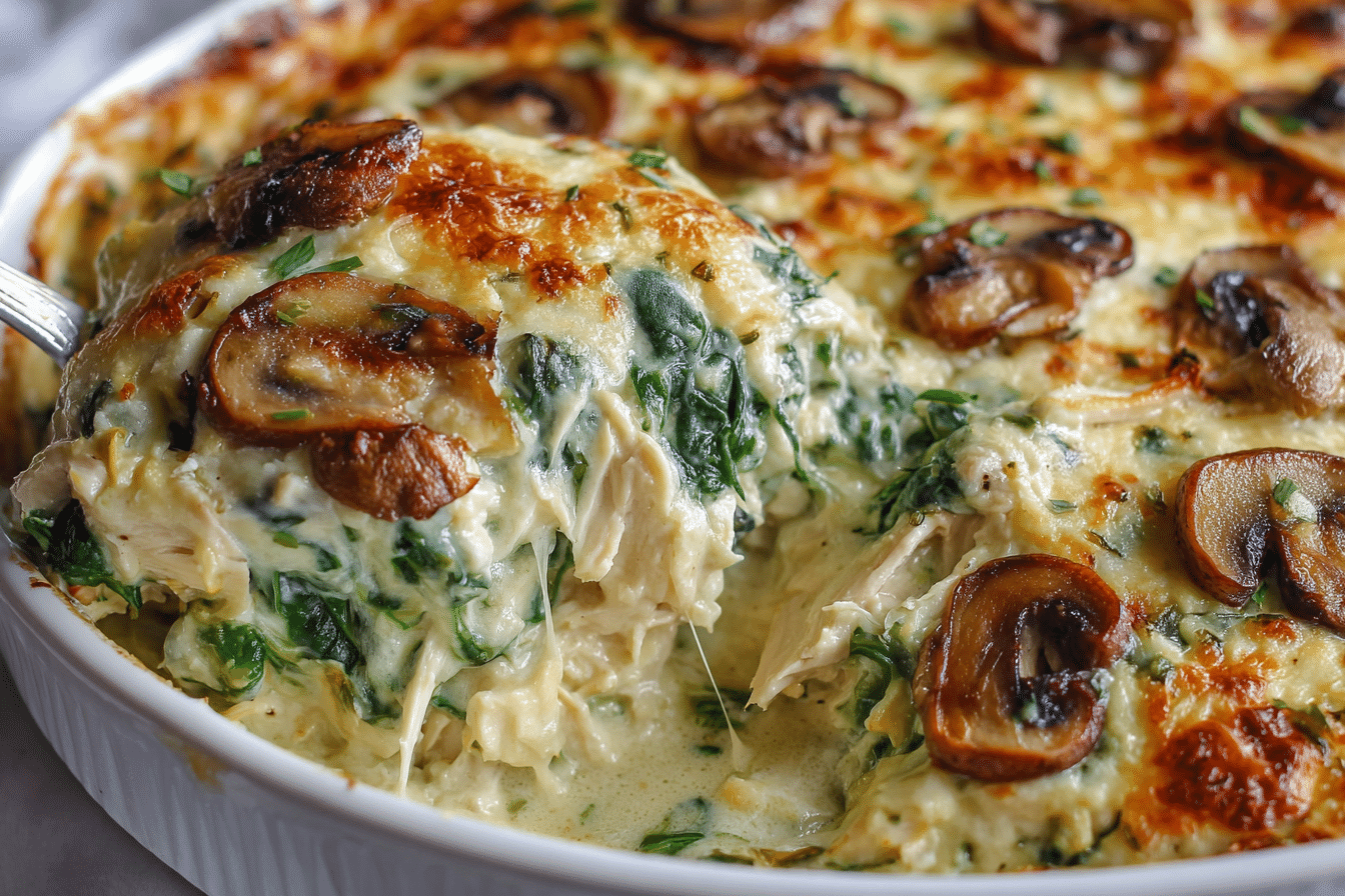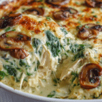 A rich, creamy chicken and spinach casserole layered with melty cheese, fresh spinach, and a savory blend of seasonings. Comforting, easy, and perfect for weeknight dinners.