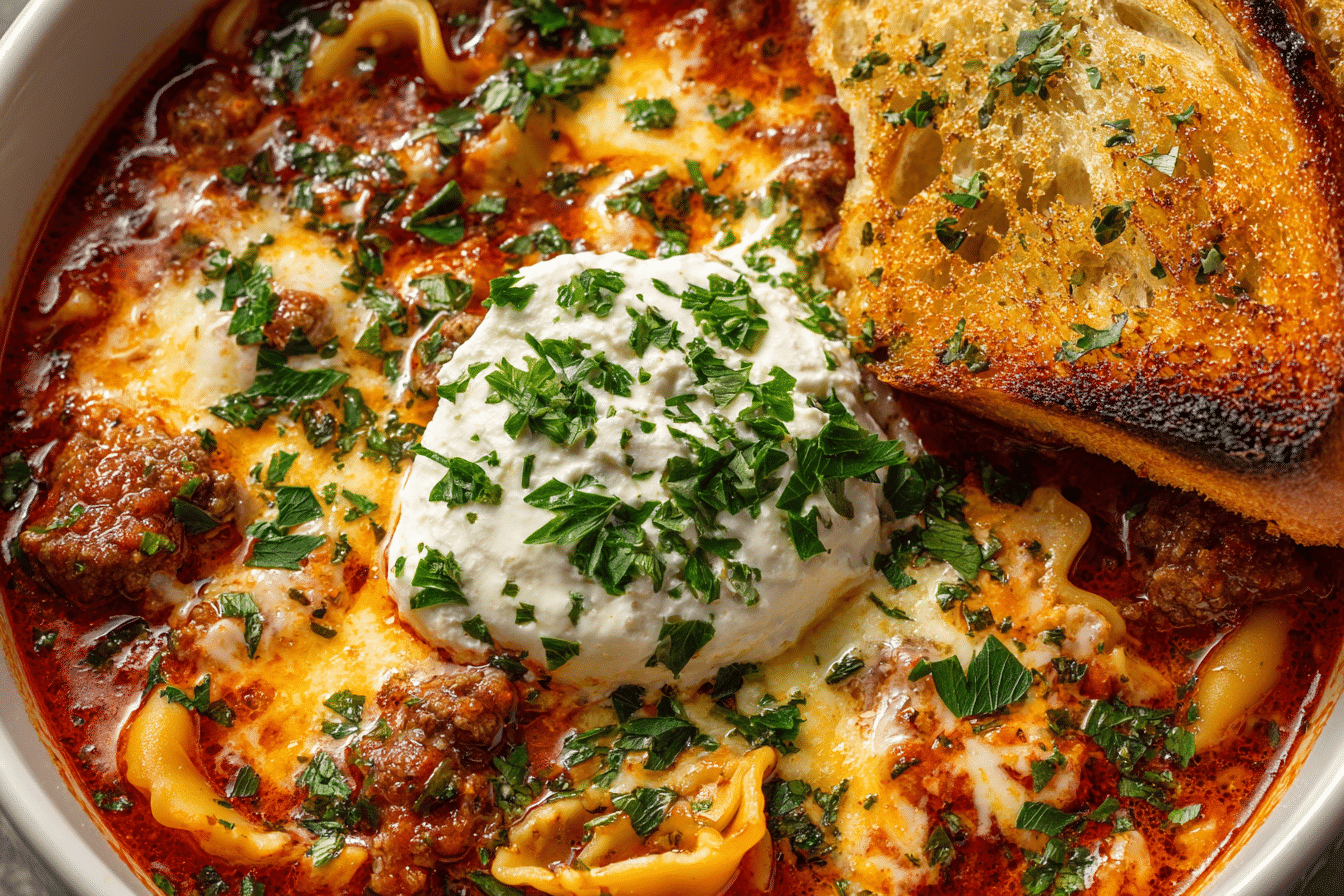Lasagna Soup is a full meal in itself but pairs wonderfully with garlic bread, a crisp Caesar salad, or roasted green beans. Serve it in deep bowls with extra cheese or chili flakes on the side for personal customization.
