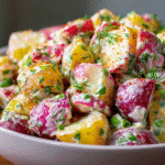 A refreshing twist on classic potato salad made with Greek yogurt, mayo, fresh dill, and tender baby potatoes. Creamy, tangy, and perfect for any summer table.