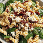 Spinach Pasta Salad with Sun-Dried Tomatoes & Feta pairs beautifully with grilled meats, sandwiches, or as a standalone lunch. Its bright, colorful presentation makes it ideal for picnics, potlucks, or family gatherings.