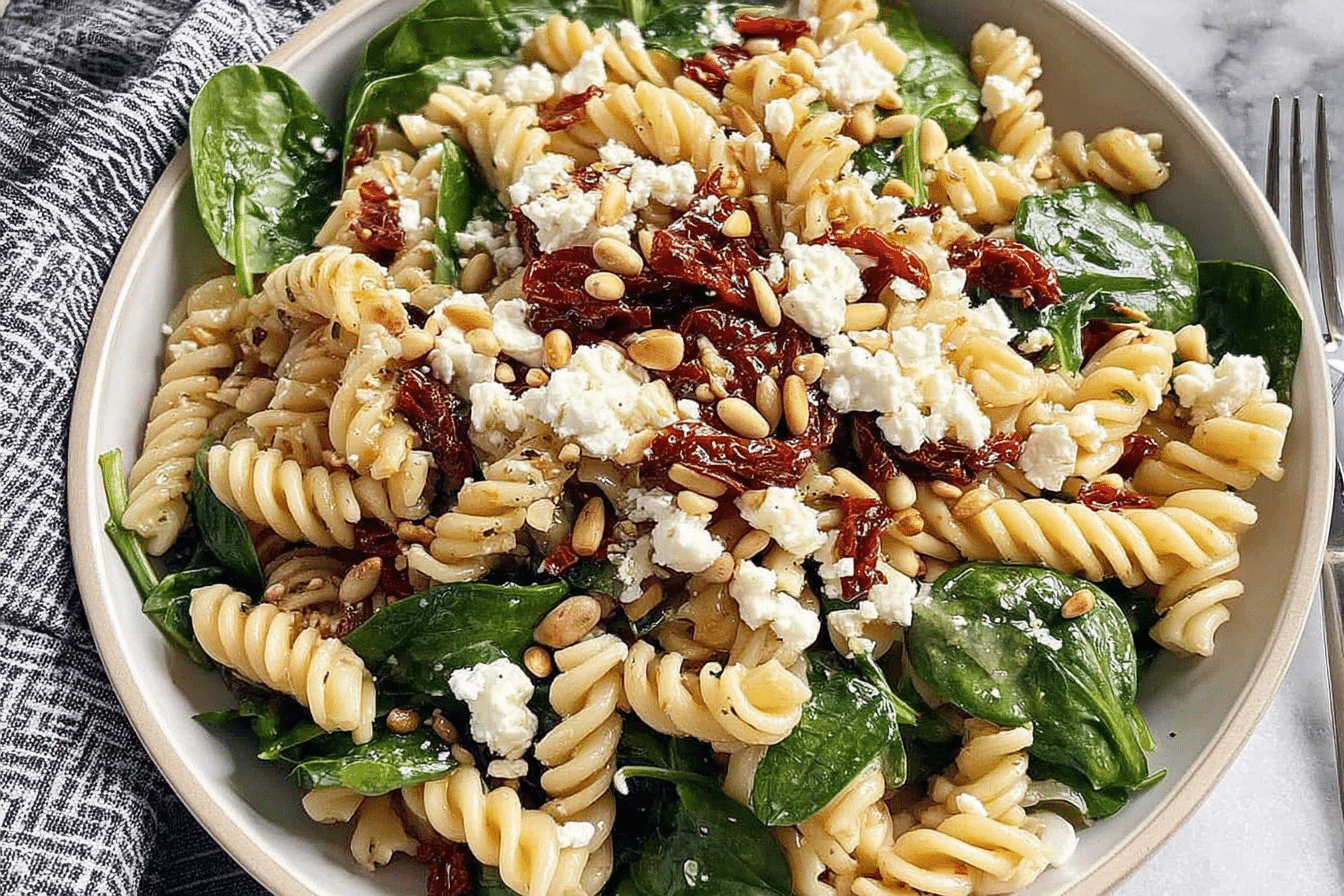 A colorful, fresh pasta salad with spinach, sun-dried tomatoes, cherry tomatoes, and creamy feta, dressed in a tangy olive oil and lemon dressing.