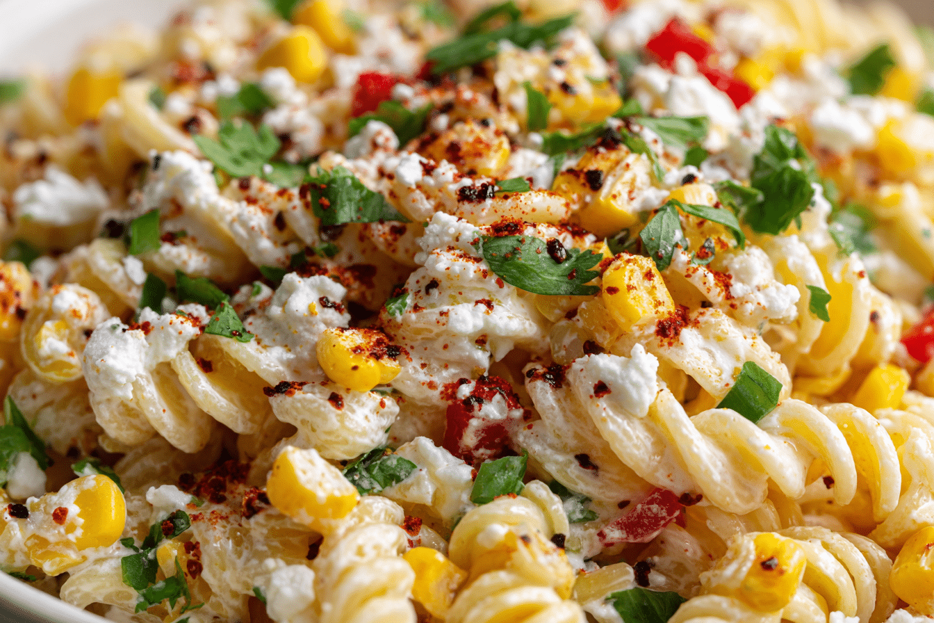 A creamy, zesty pasta salad with sweet corn, bell peppers, jalapeño, cotija cheese, and lime dressing inspired by Mexican street corn.