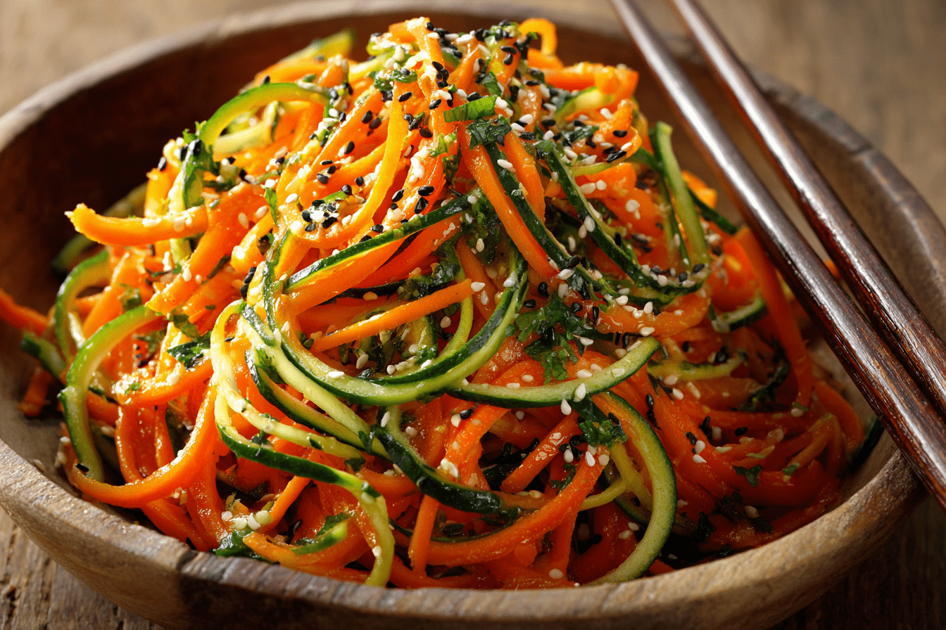 For added crunch, include thinly sliced red cabbage. It pairs beautifully with cucumber and carrot and enhances color.