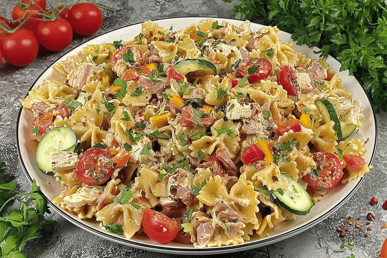 Crispy Pasta Salad mit Feta is a vibrant, satisfying dish that combines golden, lightly toasted pasta, fresh vegetables, and tangy feta cheese. This salad offers a unique twist on traditional pasta salads with its crunchy texture, making every bite delightful and full of flavor. Perfect for lunch, picnics, or casual dinners, it’s both visually appealing and irresistibly tasty.