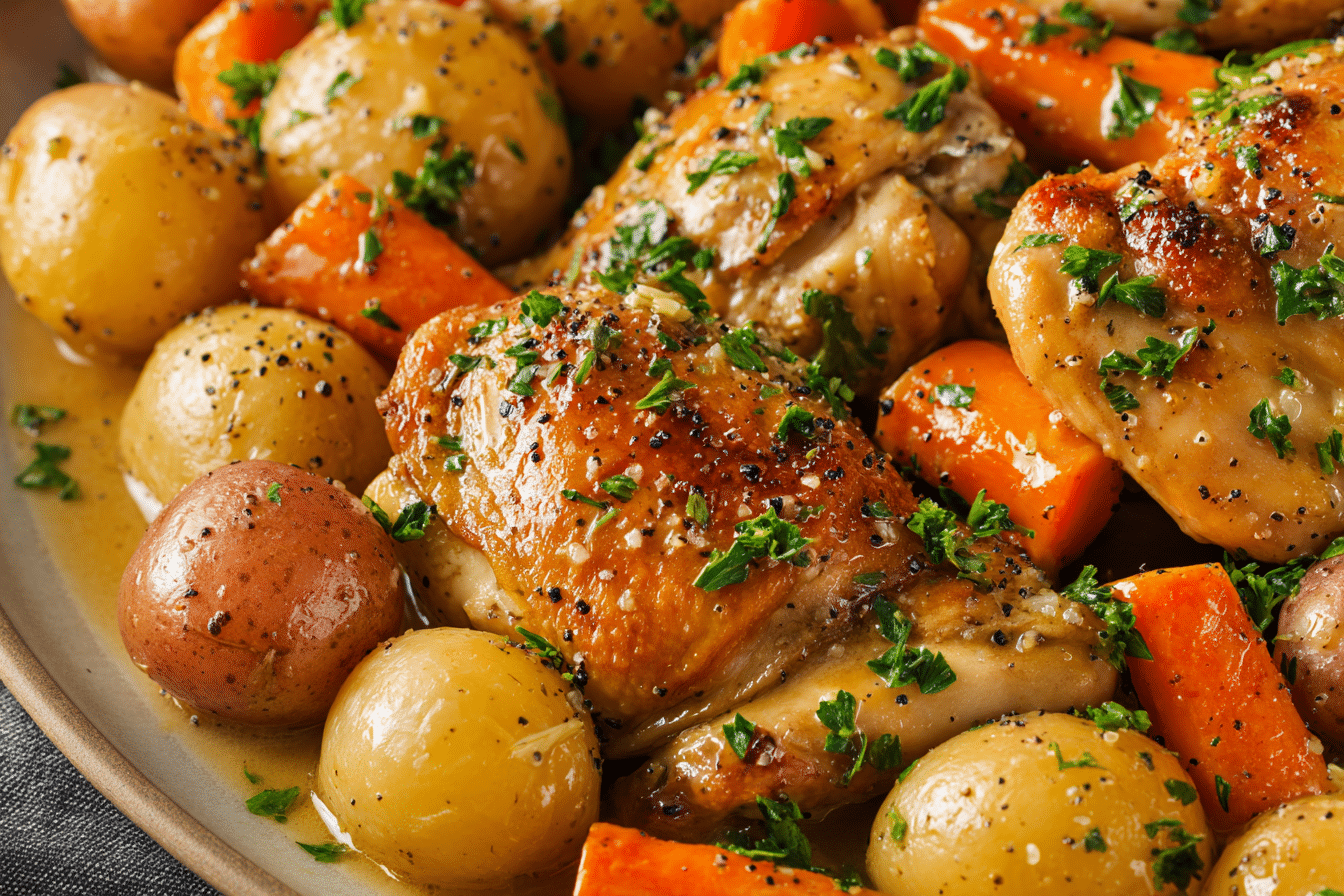 The base of this dish is boneless, skinless chicken thighs or breasts. Thighs provide extra juiciness and tenderness during slow cooking, while breasts offer a leaner alternative. Potatoes and carrots are key for texture and heartiness, absorbing the garlic butter flavors as they cook alongside the chicken. Baby potatoes are convenient, but chopped russets or Yukon gold potatoes work just as well.