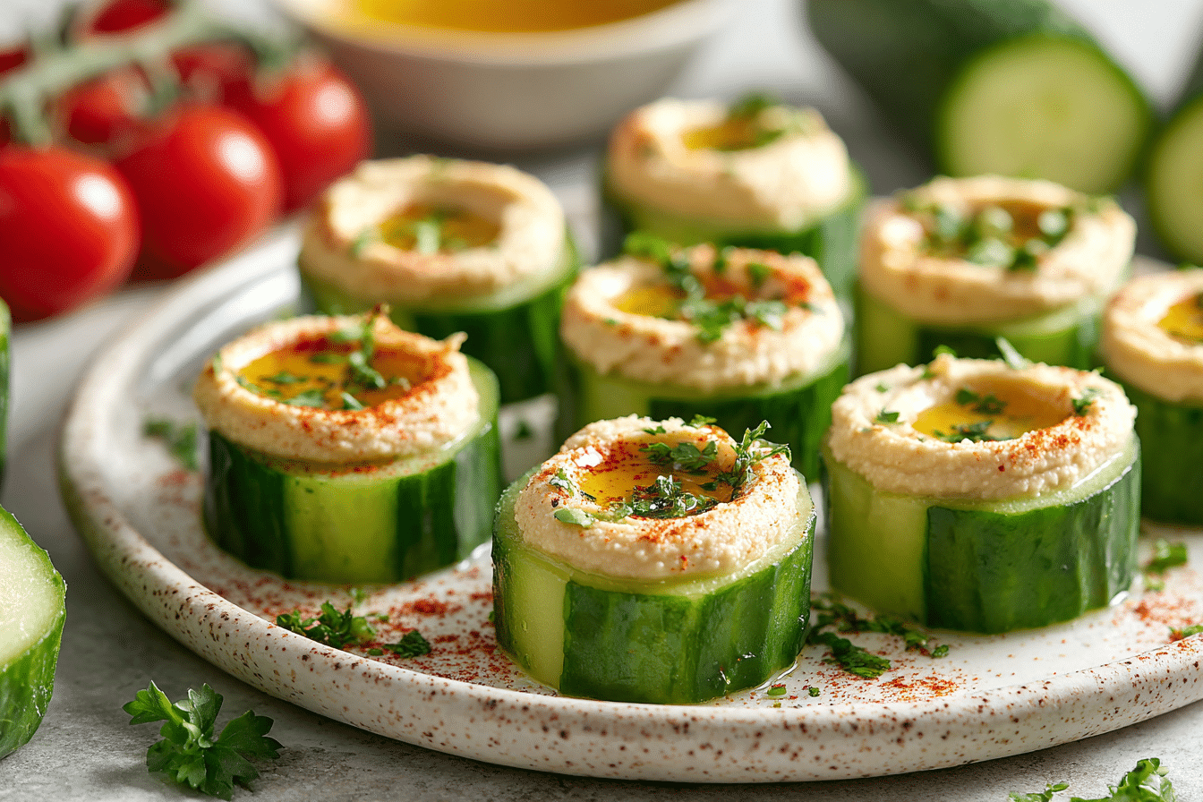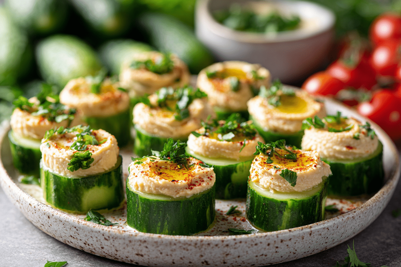 Cucumber and Hummus Bites offer a balance of fiber, plant-based protein, and healthy fats. Cucumbers are low in calories and high in water content, making them hydrating and refreshing.