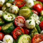 Easy Cucumber Caprese Salad is the kind of dish that brings instant brightness to the table. Crisp cucumber slices, tender mozzarella, and juicy tomatoes come together in a bowl that feels light yet deeply satisfying. Every bite delivers a gentle crunch followed by creamy richness and a burst of garden flavor.