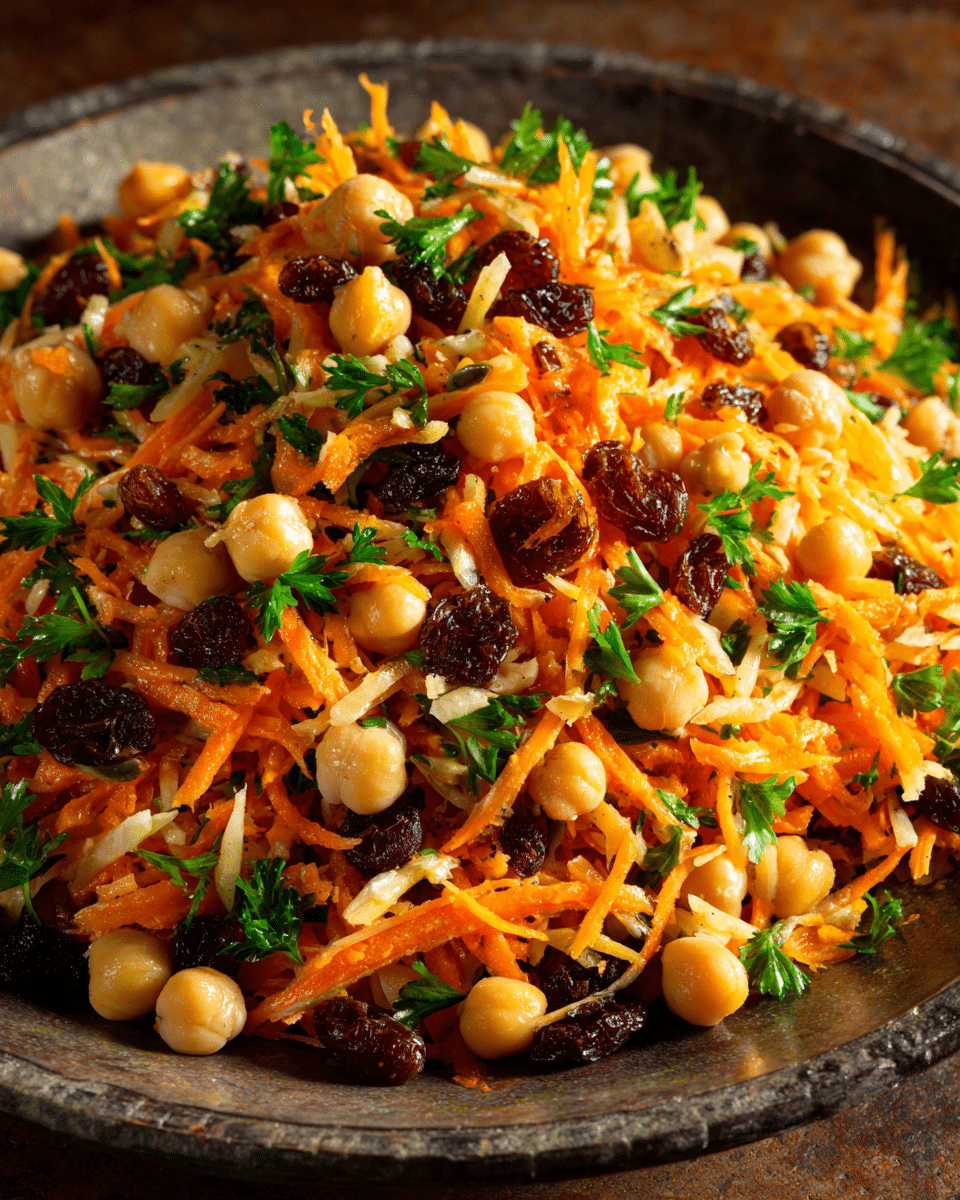 A vibrant Moroccan-inspired salad with shredded carrots, chickpeas, warm spices, and a zesty citrus dressing. Naturally vegan, gluten-free, and bursting with flavor and texture.