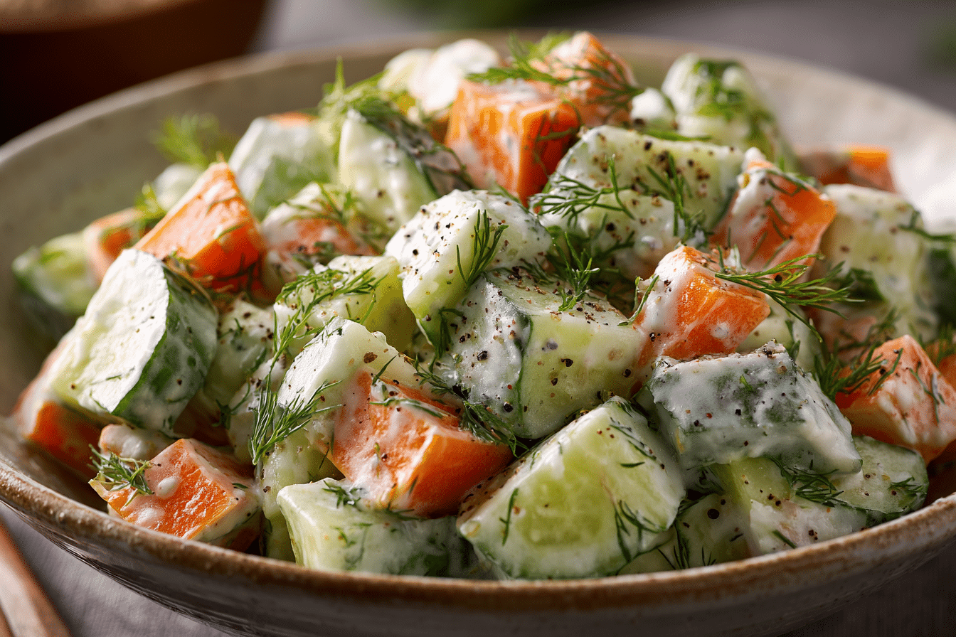 Creamy Cucumber and Carrot Salad is a light, crunchy, and refreshing dish made with fresh veggies and a tangy yogurt-based dressing. Perfect for warm weather and easy meals.