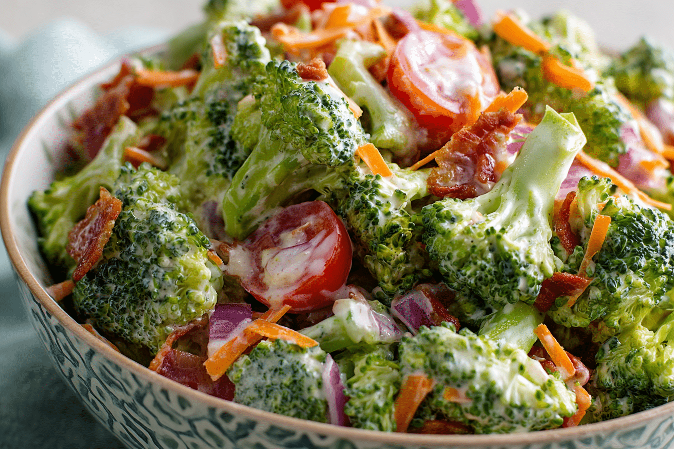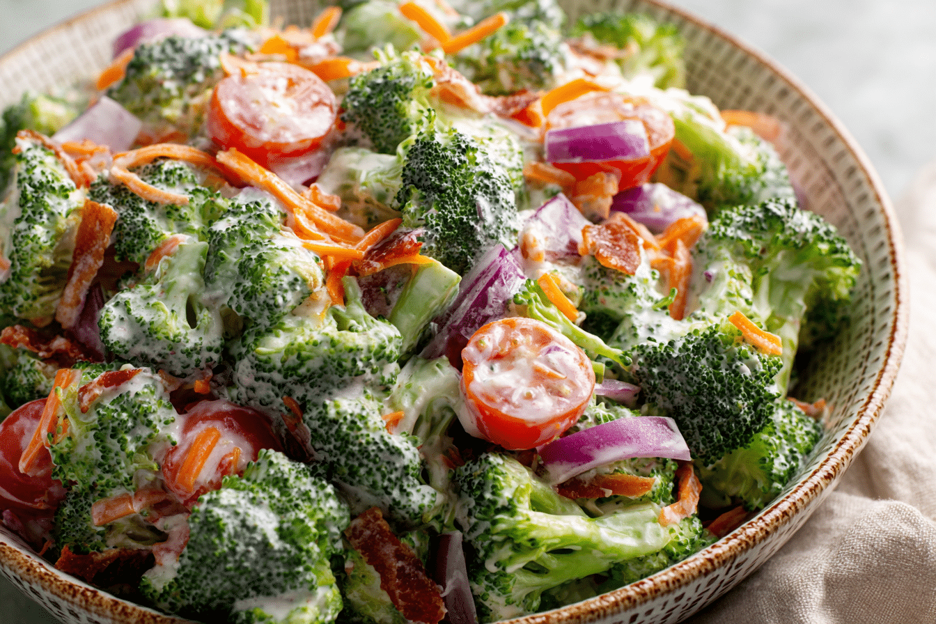 Creamy Broccoli Salad (no bacon) is a fresh, satisfying side dish that delivers crunch and richness without relying on smoky meat for flavor. Tender raw broccoli florets combine with a smooth, tangy dressing that coats every bite without feeling heavy. The result is a salad that feels balanced, vibrant, and perfect for gatherings or everyday meals.