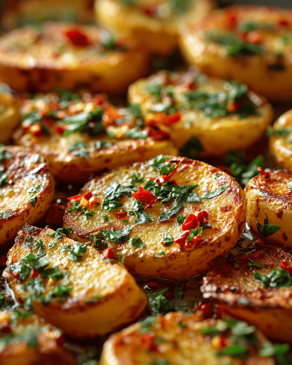 Inspired by French bistro-style potatoes and rustic home cooking, these golden rounds or wedges are slow-roasted in garlic-infused butter and olive oil until they develop a shattering crust. A final toss with chopped parsley and thyme brightens them just before serving.