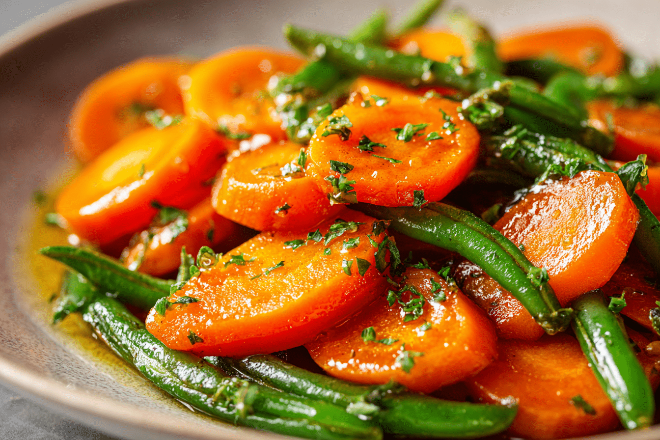 Honey Glazed Carrots & Green Beans bring together tender vegetables and a glossy, lightly sweet coating that feels both comforting and balanced. The natural sweetness of carrots deepens as they cook, while green beans retain a gentle snap that contrasts beautifully with the soft texture of the glaze.