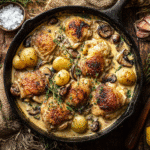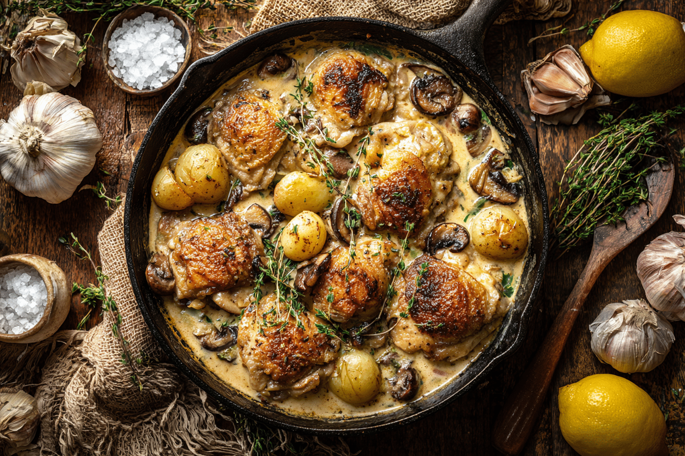 A rustic French-inspired chicken casserole braised with white wine, mushrooms, Dijon mustard, and herbs in a creamy, flavorful sauce. One pot, pure comfort.