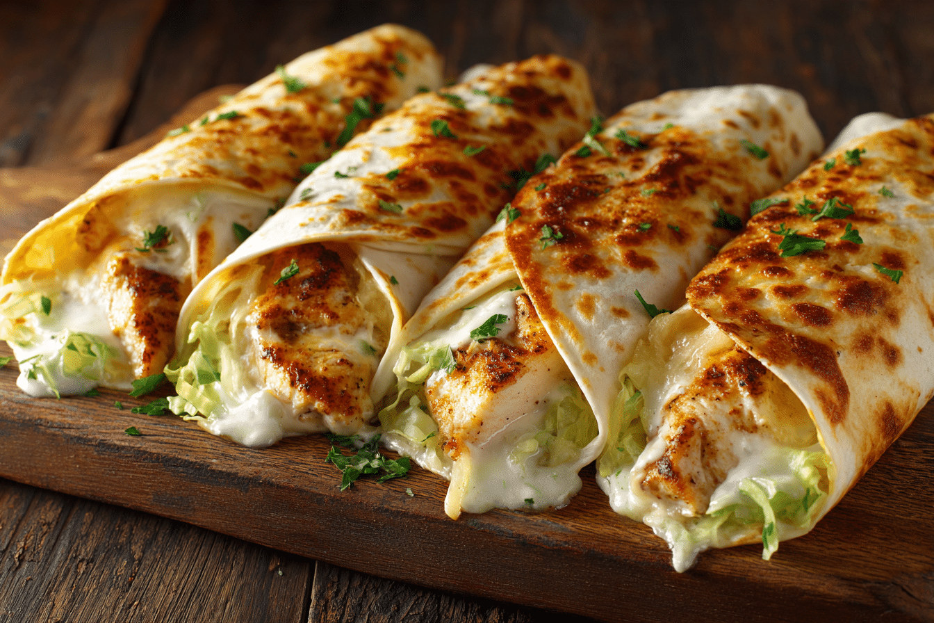 Crispy, cheesy garlic chicken wraps with juicy chicken, rich garlic sauce, and melty cheese wrapped in a golden tortilla. Fast, flavorful, and family-approved.
