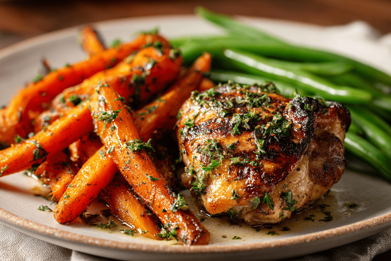 This plate shines thanks to its balance: savory chicken with crisp edges, silky roasted carrots with a hint of natural sweetness, and an herby butter sauce tying it all together. It’s perfect for home cooks who crave simple elegance in a dinner that doesn’t take all night to make.