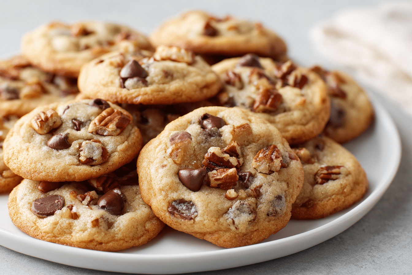 All-purpose flour is the primary structural ingredient, giving the cookies their tender yet sturdy texture. Baking soda ensures a slight rise and a soft, chewy texture, while salt balances the sweetness and amplifies the flavors of butter and chocolate. Chopped pecans are toasted for crunch and a warm, nutty undertone, complementing the chocolate chips, which provide pockets of melted sweetness.