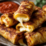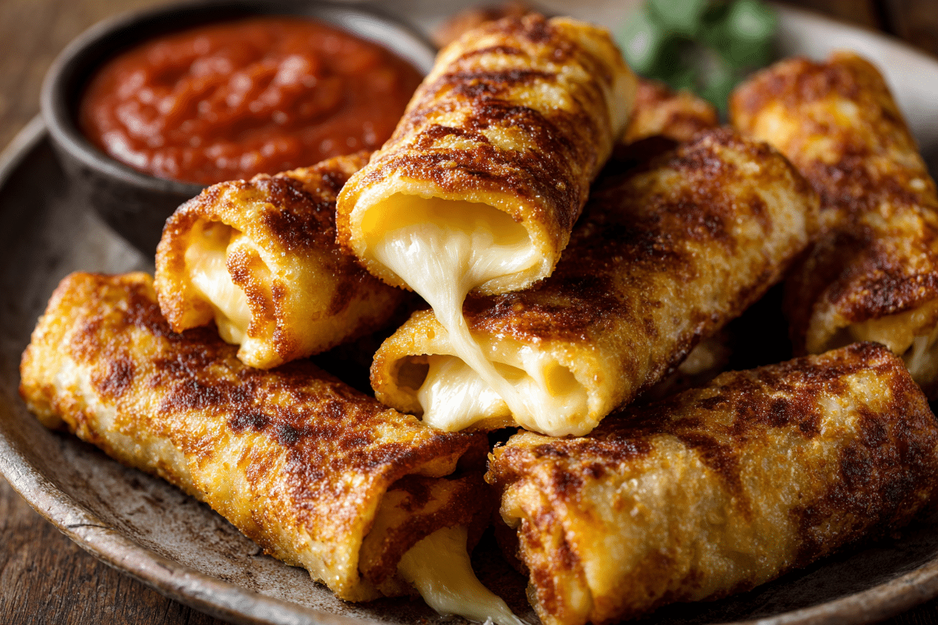 Crispy, golden roll-ups filled with gooey melted cheese, perfect for a snack or quick meal.