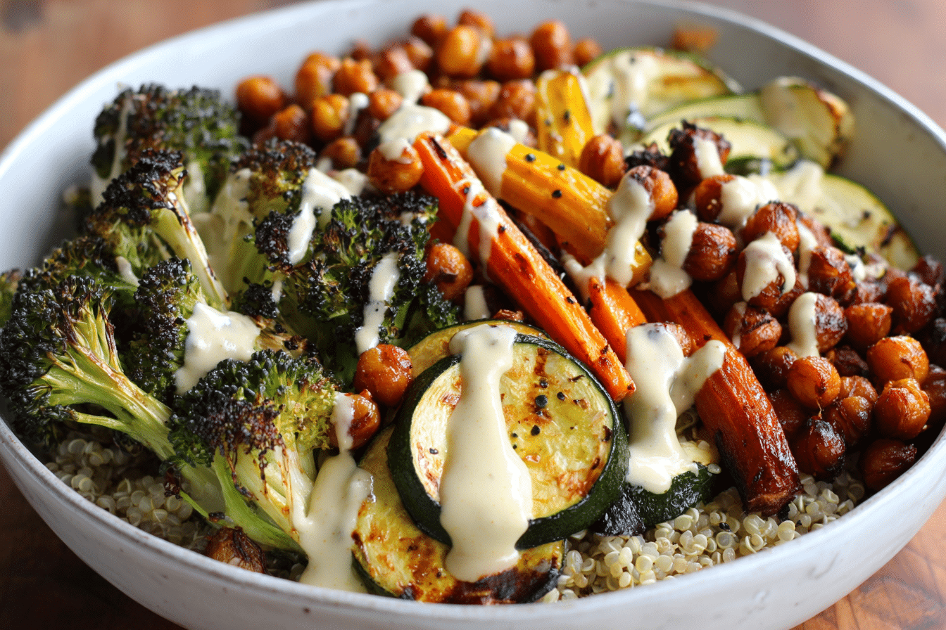 A mix of seasonal or favorite vegetables like sweet potatoes, carrots, zucchini, bell peppers, or red onion gives this bowl color, flavor, and a satisfying roasted edge.