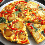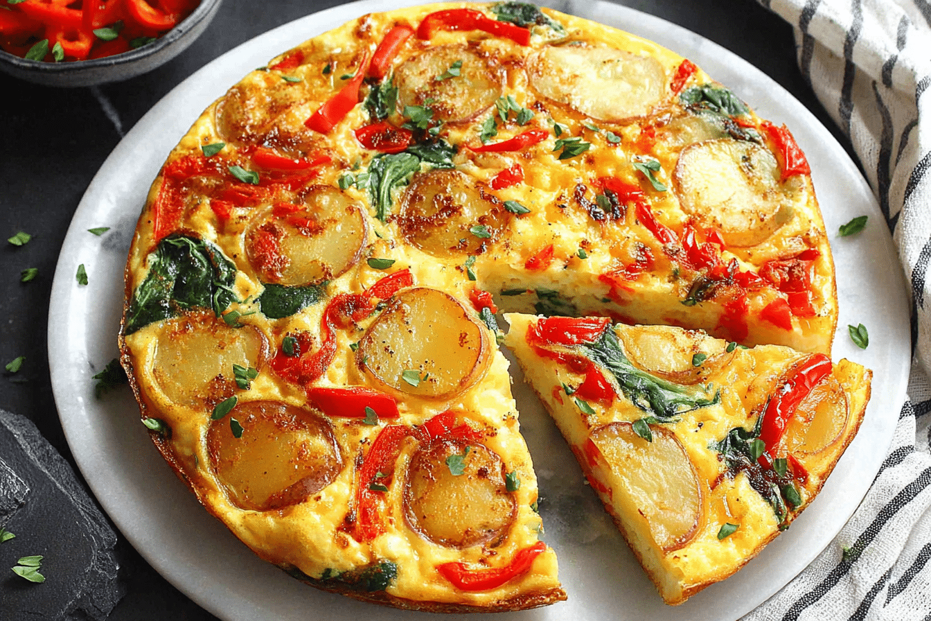 Savor the Flavor: Easy Frittata with Potatoes, Red Peppers, and Spinach Recipe is a colorful, nutrient-packed dish perfect for breakfast, brunch, or a light dinner. This frittata combines tender, golden potatoes with sweet red peppers and vibrant spinach, all bound together with fluffy, protein-rich eggs. Each slice delivers a satisfying balance of textures and flavors—soft potatoes, tender vegetables, and savory eggs—making it a comforting and versatile meal.