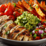 The herb-marinated grilled chicken is juicy and aromatic, balanced by crispy oven-roasted sweet potato fries and topped with a creamy, zesty avocado salsa. It’s a full meal that feels indulgent but is packed with nourishing ingredients — ideal for lunch, dinner, or even meal prep.