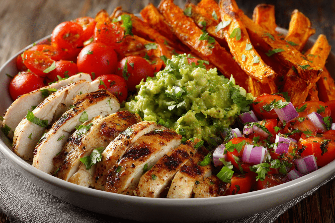 A fresh, balanced bowl with herb-marinated grilled chicken, crispy roasted sweet potato fries, and creamy avocado salsa — perfect for meal prep or healthy dinners.