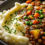 Hearty Lentil Stew with Creamy Mashed Potatoes is a satisfying vegetarian meal that combines rich, earthy lentils with velvety potatoes to create a filling and comforting dinner. This dish is full of flavor, featuring tender lentils simmered with aromatic vegetables, herbs, and spices, complemented by smooth, buttery mashed potatoes that soak up every bit of the savory stew.