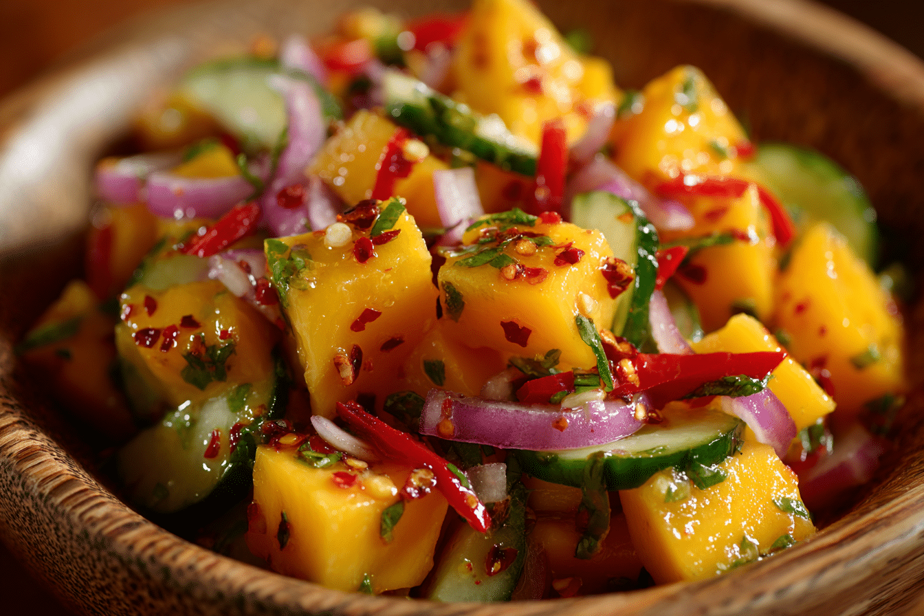 Mango Salad shines as a side dish alongside grilled chicken, fish, or seafood. The bright acidity cuts through richer main courses, offering contrast and freshness.