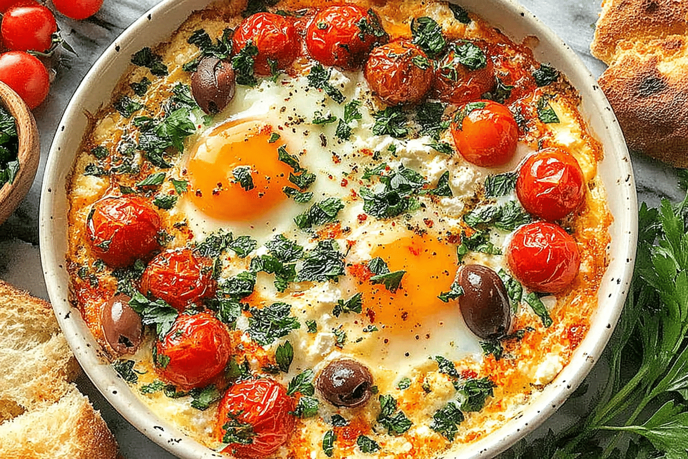 Once baked, remove from the oven and let it rest for 2–3 minutes. Drizzle a little extra olive oil over the top and garnish with fresh parsley or basil. Serve warm, directly from the baking dish, with crusty bread, pita, or low-carb crackers to scoop up the creamy feta and eggs.