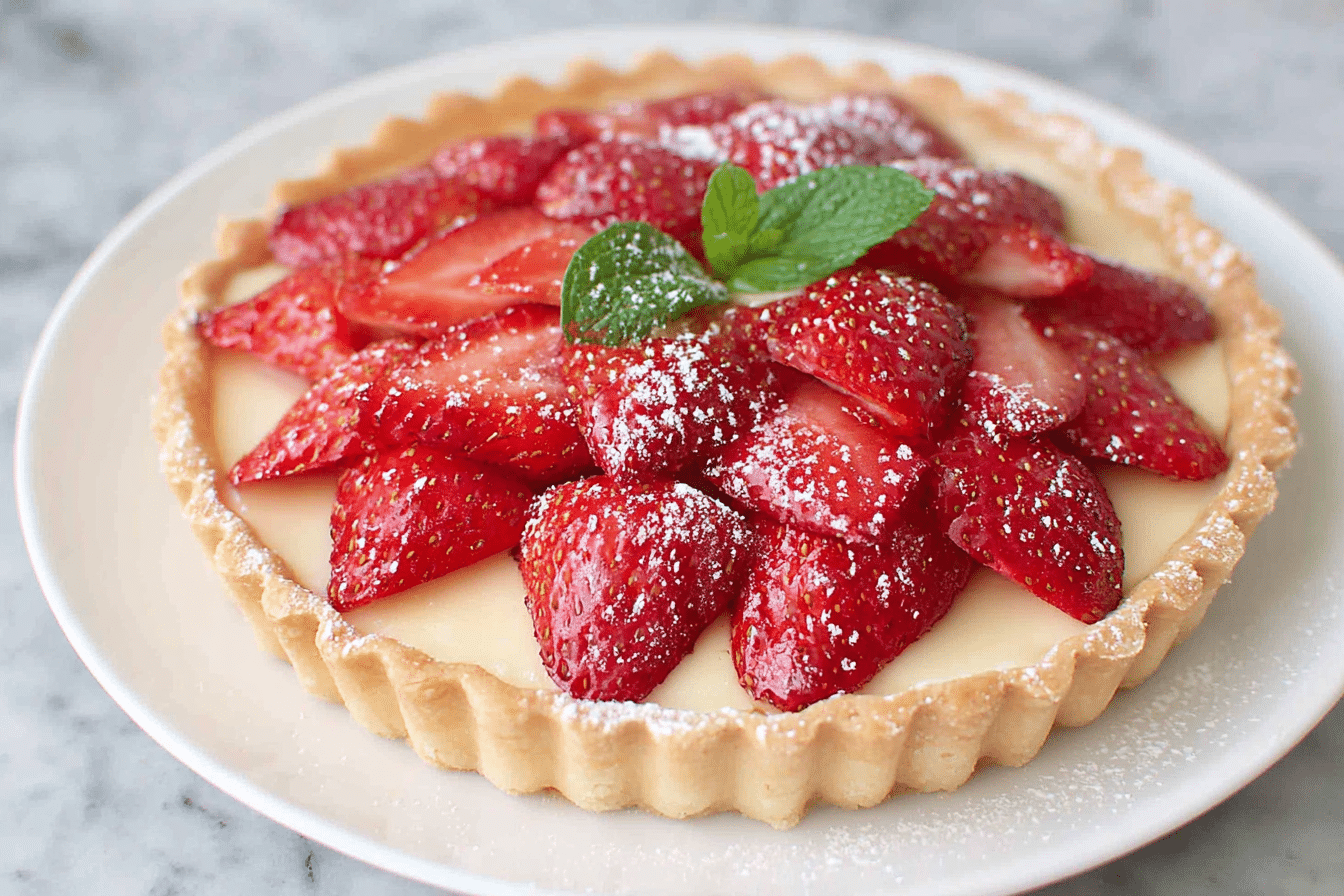 A classic strawberry tart featuring a buttery shortcrust pastry, silky pastry cream, and fresh strawberries with a glossy apricot glaze.