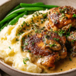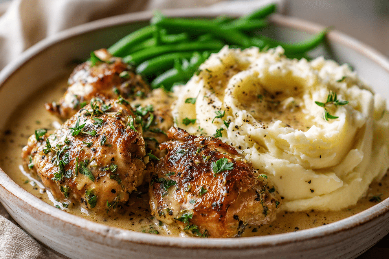 Irresistible Garlic Herb Chicken with Creamy Mashed Potatoes is a comforting meal featuring golden seared chicken in a garlic herb sauce served over smooth, buttery mashed potatoes.