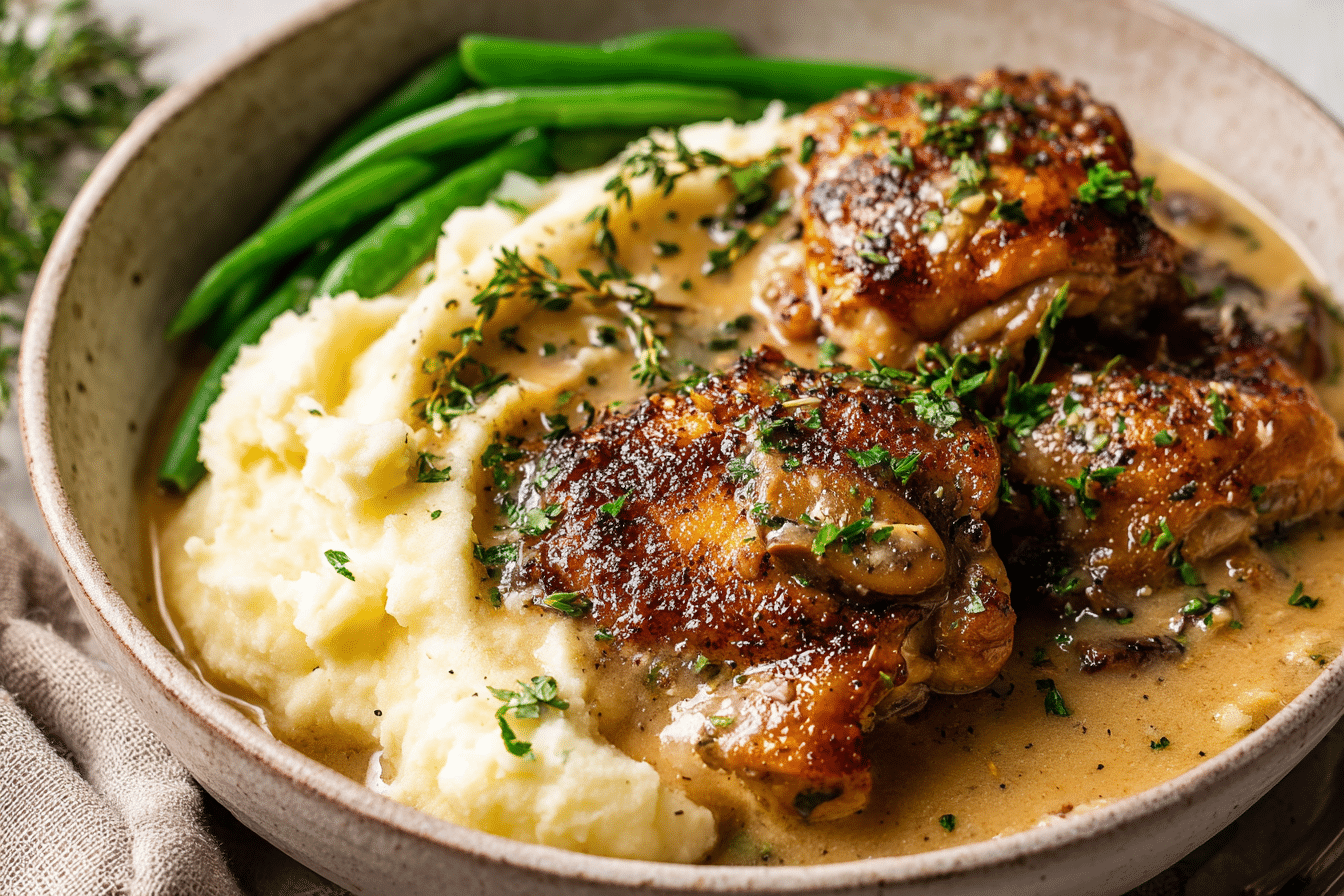 Irresistible Garlic Herb Chicken with Creamy Mashed Potatoes is a comforting meal featuring golden seared chicken in a garlic herb sauce served over smooth, buttery mashed potatoes.