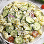 A refreshing pasta salad featuring tender rotini, crisp cucumbers, colorful vegetables, and a tangy dressing, perfect for summer meals.
